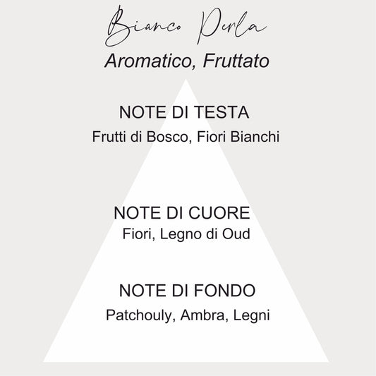 La magia di Bianco Perla prende vita sin dalle prime note che si diffondono nell'aria: i frutti di bosco e i fiori bianchi. Questo incontro di aromi non è lasciato al caso; rappresenta l'alba di un viaggio sensoriale dove la dolcezza dei frutti di bosco si fonde con la purezza dei fiori bianchi, creando un'accoglienza olfattiva calorosa e avvolgente. È come entrare in un giardino segreto al primo mattino, quando il mondo esterno sembra ancora addormentato.